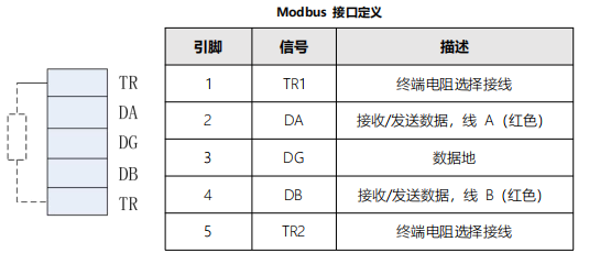 模塊使用自用2*5Pin歐式彈簧端子作為 Modbus RTU 通信的物理接口,其中兩個 TR 是終端電阻選接線。在內部模塊內部集成了 120Ω 的終端電阻。當 TR1 與 DA, TR2 與 DB 短接終端電阻有效。接口定義如下表所示