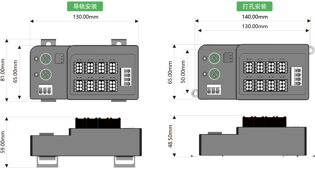 安裝方式:DIN35導軌安裝或雙側耳打孔安裝