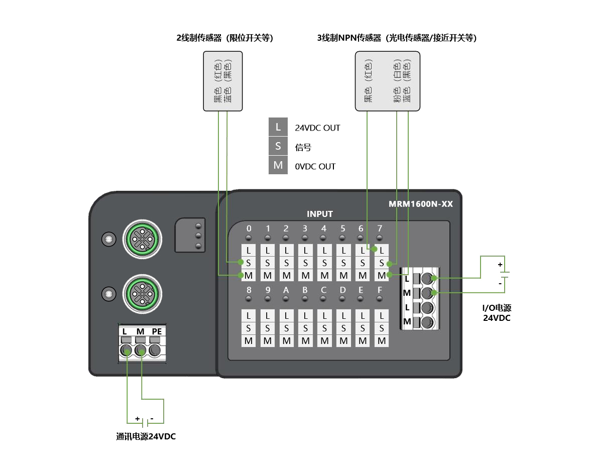 面板式快接線分布式I/O,EtherCAT通訊,2xM12,可級聯;數字量16入 NPN,24VDC,歐式彈簧端子;導軌安裝&打孔安裝(下單時需備注)